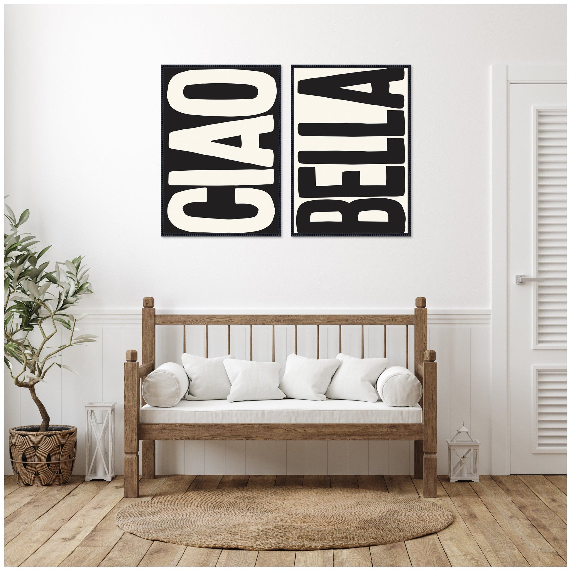 - Ciao Bella Typography Black and White 2 Piece framed canvas set is giclee printed using fade-resistant inks, ensuring every detail comes to life in rich, lasting color