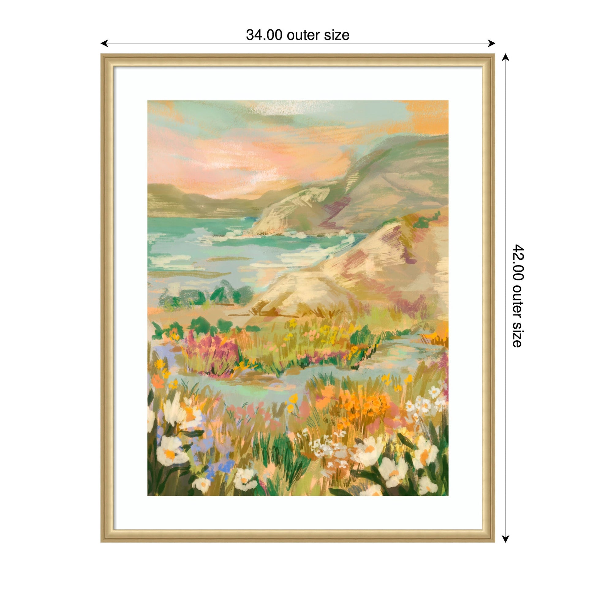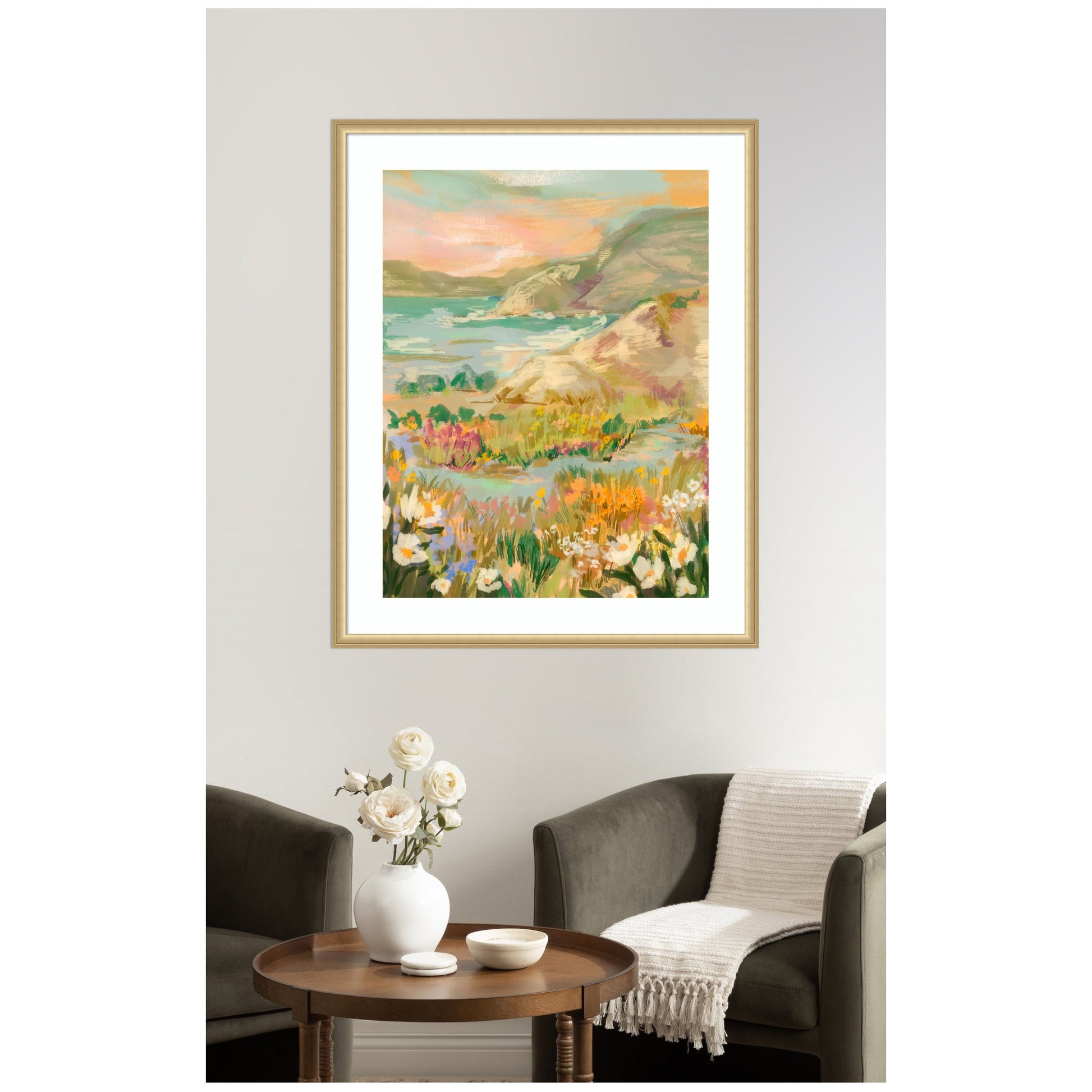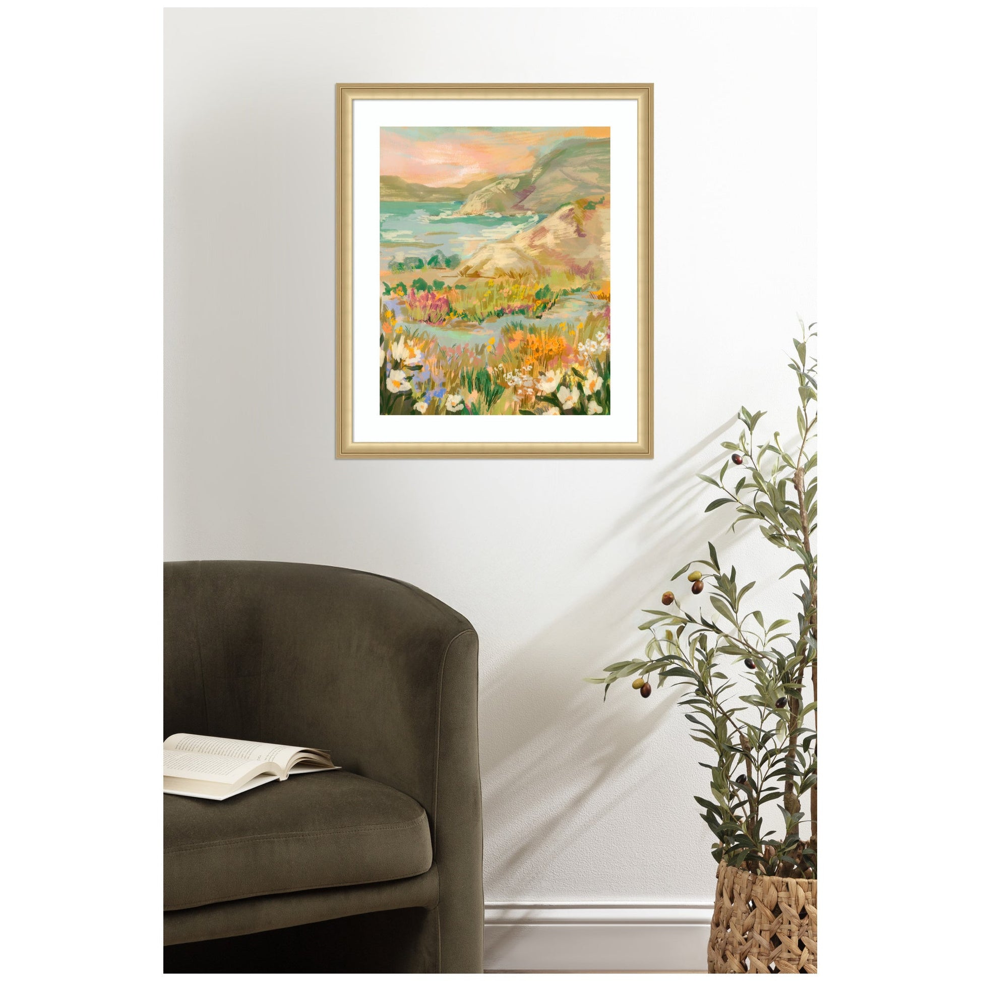 Elevate your space through thoughtfully curated style with this stunning piece designed by independent artist Annie Quigley and beautifully framed by hand in Madison, WI. The image is giclee printed using fade-resistant inks, ensuring every detail comes to life in rich, lasting color. Set in designer moulding, its a Coastal accent crafted to make a statement. Visual Story: The artwork depicts a serene coastal landscape bathed in the soft, warm hues of a setting sun. A lush foreground of colorful wildflowers leads the eye towards gentle waves and rolling hills in the distance. The overall composition evokes a sense of tranquility and natural beauty.