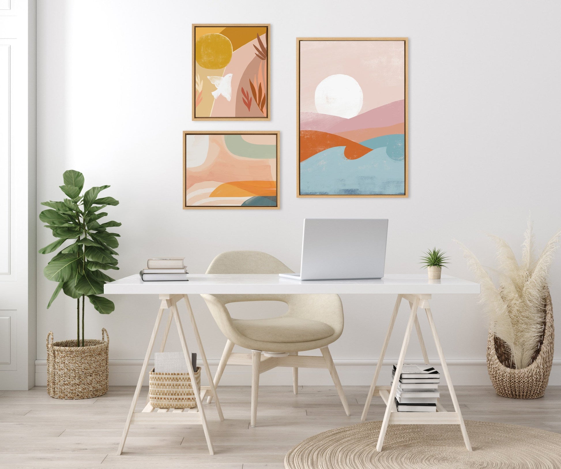 Kate Aurelia Holloway's "Endless Summer Vertical" captures the soft boho essence with this collection of peaceful depictions. Printed and framed in the USA in Waunakee, Wisconsin, this framed floating canvas art set will be a pleasure to look at every day in your living room, bedroom, office, or any room in the home. These art set also makes an excellent gift for birthdays, holidays, or house-warming parties. Printed on gallery-wrapped canvas and framed with a lightweight polystyrene frame, this wall art is easy to display on the wall. Display dimensions of the largest piece are 23 inches by 33 inches and the two smaller canvases are each 16 inches by 20 inches.